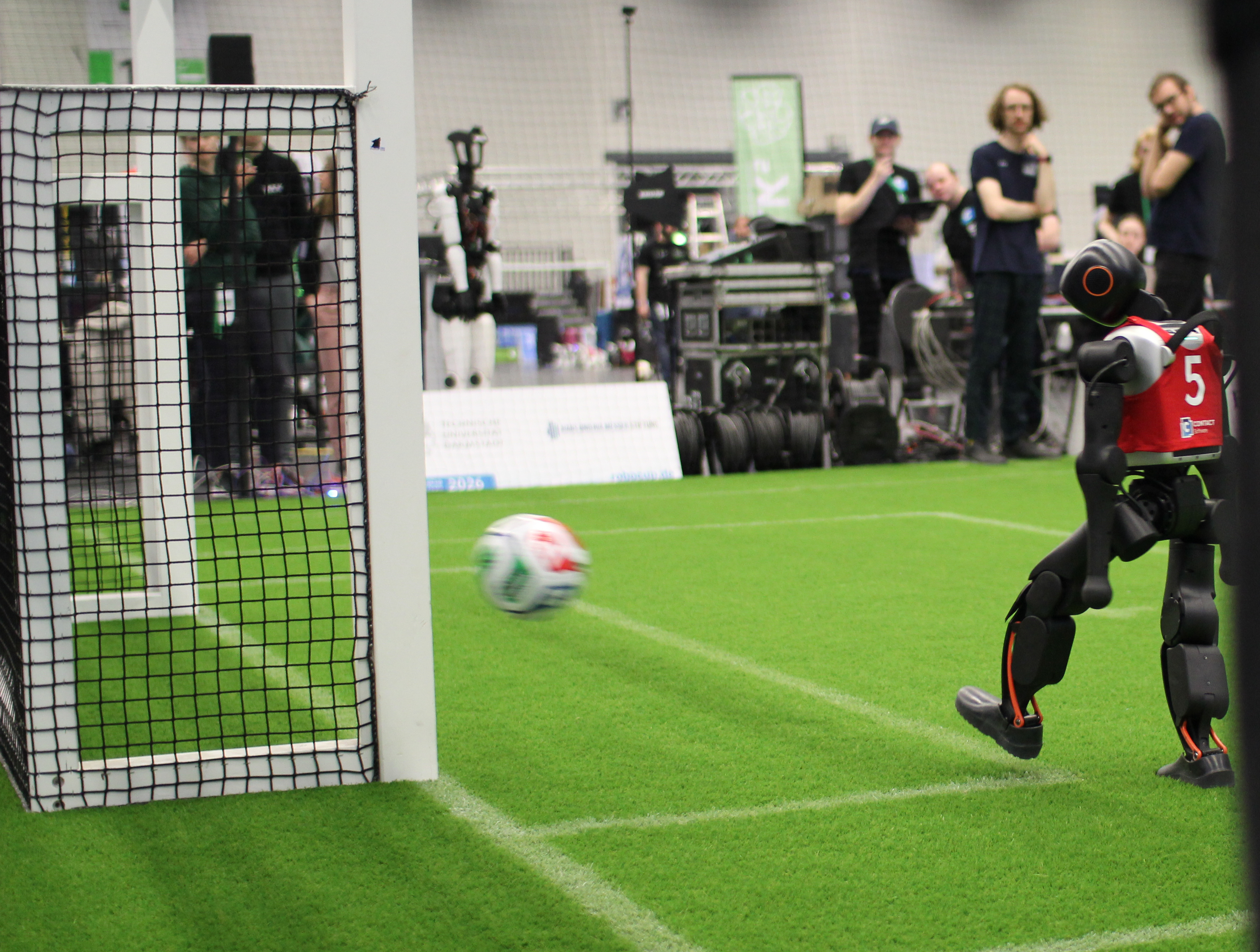 The goal is empty and our robot kicks the ball really hard. The photo was taken in our first match against HTWK Robots.