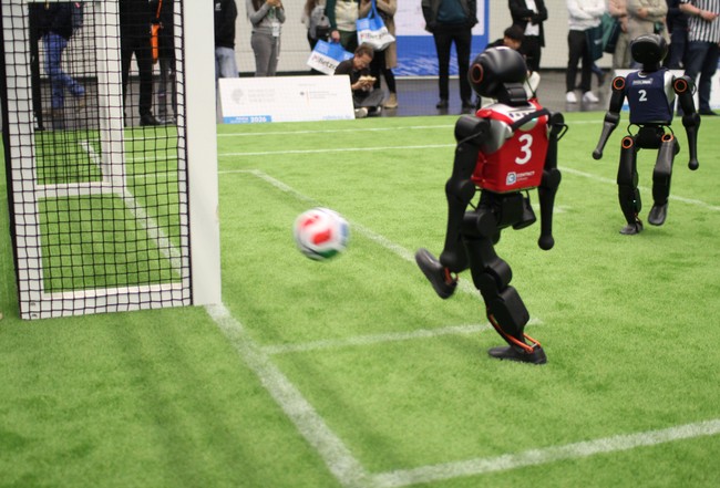 - The goal is empty and our robot kicks the ball into it. The approaching opponent robot cannot interfere anymore. The photo was taken in our first match against HTWK Robots.