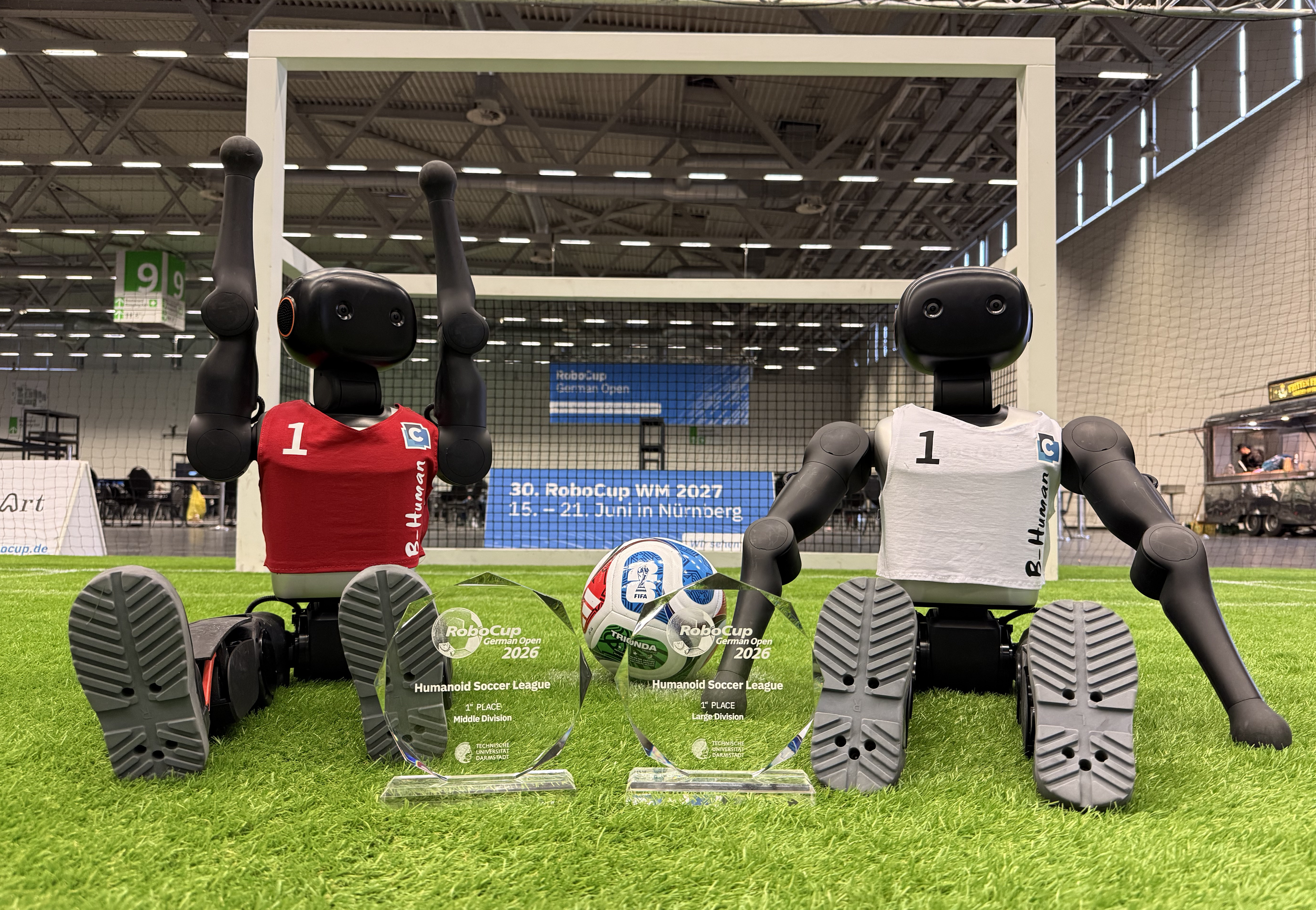 Two of the robots that who won the RoboCup German Open 2026, along with their trophies.